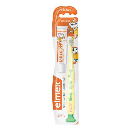 elmexSPAZZOLINO EDICATIVO PER BAMBINI 0-3 Studiato appositamente per una pulizia delicata dei primi dentini. La testina piccola con rivestimento morbido è particolarmente indicata per la bocca dei piccoli. Le setole morbide e arrotondate proteggono le gengive e puliscono accuratamente ma deli...